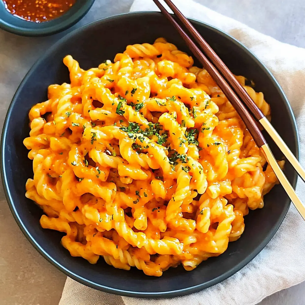Mix Pasta & Sauce: Add the cooked pasta to the sauce in the pan. Stir gently until the pasta is fully coated in the creamy Gochujang sauce.